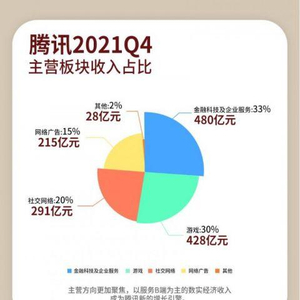 2021年四季度,金融科技和企业服务板块的营收同比增长25%,达到了479.58亿元,首度超越网络游戏板块,成为腾讯营收贡献最大的业务板块。