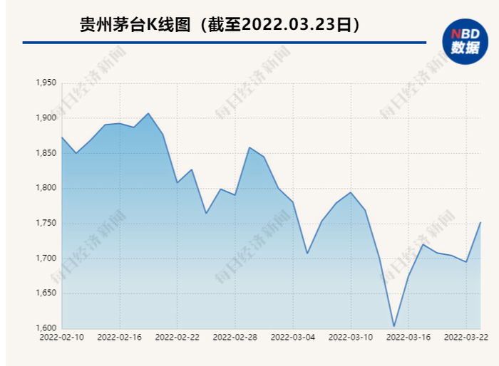 今年以来,贵州茅台股价一路震荡下行,从年初的2050元下跌至3月23日收盘的1752元,跌幅达14.54%。值得注意的是,3月22日贵州茅台当日更是跌破1700元。