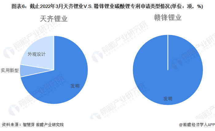 赣锋锂业的碳酸锂专利全部为发明专利,并无实用新型和外观设计专利数量。赣锋锂业的碳酸锂发明专利数量为50项。而天齐锂业的专利以发明专利为主,天齐锂业的发明专利有48项,约占碳酸锂专利总数量的72%,实用新型专利4项,占比约6%,外观设计专利15项,占比约22%。