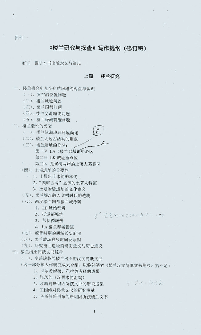 与《〈楼兰的发现〉编写提纲》的内容相比,这份《〈楼兰研究与探查〉写作提纲》更加详尽和全面,其内容包括了前者,又在论题和研究内容等方面有所超越,体现了1996年到2004年期间侯灿先生对于楼兰研究的深入和扩展。