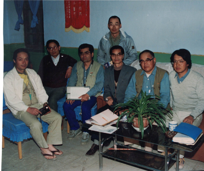 1988年10月11日,侯灿先生会见早稻田大学长泽和俊教授(右二)、伊藤敏雄(右一)、中岛幼八(翻译、后排高坐者)以及朝日新闻社记者。