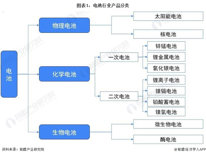 电池是一种能量转化与储存的装置,其行业细分且品类较多。电池按产生电能的原始能量不同,可以分为化学电池、物理电池和生物电池。