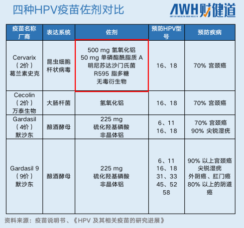 GSK公司在2价疫苗里使用的AS04佐剂,在疫苗剂量等于或低于传统铝佐剂默沙东4价疫苗里相应型别剂量的情况下,抗体水平是后者的数倍,而且还显示广谱效果(可以接近5价疫苗),所以佐剂是提高疫苗免疫效果的重要途径。