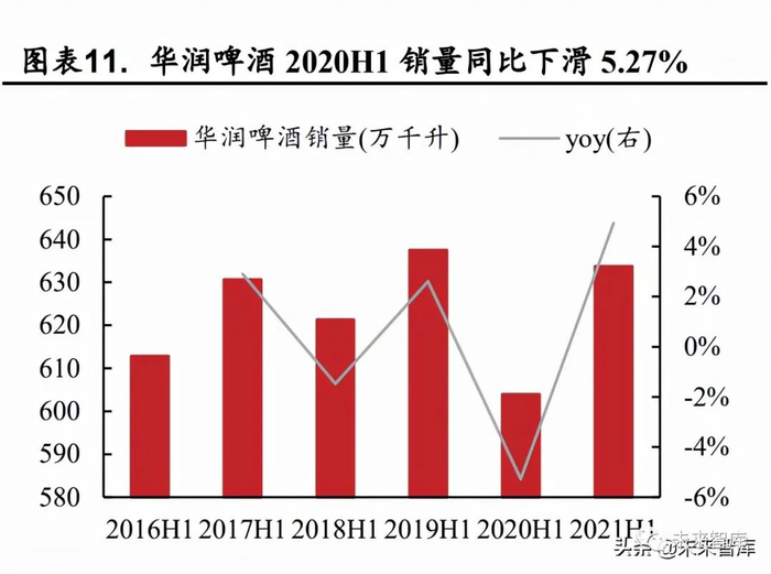 从销量端来看,受到疫情冲击啤酒厂商 2020H1 销量均出现显著下滑, 2020H2 销量恢复至往期水平。其中青岛啤酒 2020H1 销量同比下滑 6.84%, 华润啤酒 2020H1 销量同比下滑 5.27%。各啤酒厂商在 2020H2 销量基本恢 复至疫情前水平,2020H2 青岛啤酒销量为 341.1 万千升,超越 2019H2 的332 万千升;华润啤酒 2020H2 销量为 506.1 万千升,与 2019 年同期相比微增 0.04%。