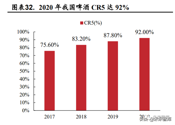 疫后龙头有望进一步抢占市场份额。2020年我国啤酒行业CR5达92%, 疫情影响下市场集中度进一步提升,其中华润啤酒、青岛啤酒及燕京啤酒市 场占有率分别达 31.9%、22.9%和 19.5%,为啤酒第一梯队;燕京啤酒、重 庆啤酒及珠江啤酒为啤酒行业第二梯队。我国啤酒市场已经从高度分散走 向相对整合,大厂商通过不断收购实现行业集中度的提升。对标海外,根据 US Beer Handbook 数据,美国 1999 年啤酒行业整合后形成一超两强局面, CR3 为 90%,我国啤酒行业市场集中度仍有提升空间。
