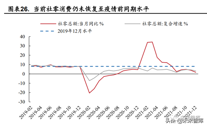 当前我国消费恢复仍弱于疫情前同期水平。2021 年 12 月社会零售总额 同比增长 1.7%,复合口径下增长 3.13%,仍弱于疫情前同期(2019 年 12 月) 水平。消费恢复速度慢于预期可能有几方面原因,一是尽管失业率下移至 2019 年水平,但需求端人均可支配收入尚未恢复至同期水平。人均可支配 收入水平的被动降低造成了消费的低迷,2021 年春节、清明节、劳动节及 十一长假,旅游收入仅为 2019 年同期水平的 82%、57%、77%和 60%;二 是多地疫情零星反复,“就地过年”等政策抑制消费需求。2021 年多地疫情 反复零星多发,叠加“就地过年”等政策因素,人们外出需求减少,消费恢 复速度较弱。