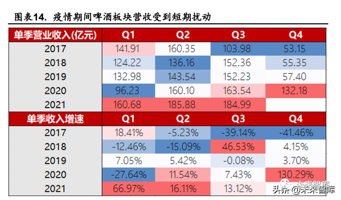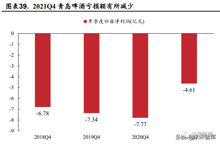 啤酒传统淡季,公司 2021Q4 归母净利润为-4.61 亿元,扣非归母净利 润约为-10.22 亿元。公司 2021 年 Q4 归母净利润约为-4.61 亿元,2020 年为 -7.77 亿元;2021 年扣非归母净利润约为-10.22 亿元,2020 年为-8.62 亿元, 公司 Q4 单季亏损有所扩大。Q4 扣非归母净利润低于预期短期承压,主要 由于 Q4 为啤酒传统销售淡季,叠加疫情点状反复、原材料成本上涨、年底 费用核算等因素导致。