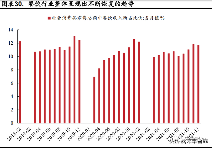 随着疫情影响的逐步减弱,餐饮渠道加快恢复脚步。2021 年 3 月国内 限额以上餐饮企业的收入占社会消费品零售总额的比值为 9.89%,2020 年 同期水平为 6.93%,同比增长 2.96pct。2021H2 点状疫情多发,餐饮占比有 所收缩,当前恢复虽然仍弱于疫情前的水平,但整体趋势向好。随着疫情的 进一步恢复,餐饮行业在社会消费品零售总额中的占比或将继续不断上升。