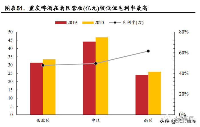 西部之王深化执行“大城市”计划,疫情转好背景下疆外拓展有望加 快。大城市计划是重庆啤酒重要的生意增长引擎,重庆啤酒通过丰富的产品 组合,完善分销网络布局,持续加强经销商能力建设,加速市场精耕。在供 应网络方面,公司经营酒厂数量(含参股的重庆嘉威)从 14 家增加到 25 家, 能够在采购、生产、物流等环节,在更广阔的区域内实现联动,形成合力。当前,公司在南区市场营收占比为 24.46%,但毛利率达 61.48%,远高于西 北部地区的 47.67%及中部地区的 49.56%。南部地区毛利率增速较高,同比 增长 8.74pct,预计未来重庆啤酒仍将对南部地区发力。(报告来源:未来智库)