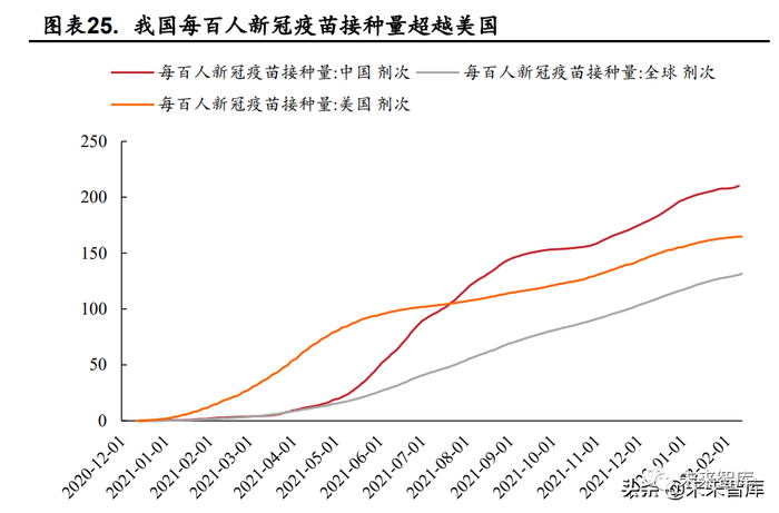 历经三个阶段,我国疫情得到有效控制。新冠肺炎疫情持续近两年,我 国疫情防控历经三个阶段:第一阶段是突发疫情应急围堵阶段;第二阶段是 常态化防控探索阶段;2021 年 8 月起,我国进入疫情防控第三阶段,即全 链条精准防控的“动态清零”阶段。当前,全球疫情波折反复,我国坚持“四 早”原则,在发热门诊监测的基础上,将监测关口前移一步,部署各地对口 岸高风险人员等 12 类人群“应检尽检”,定期开展核酸检测。目前,我国疫 苗每百人新冠疫苗接种量为 210.27 剂次,超越全球水平(130.71 剂次)和 美国水平(164.79 剂次),疫情防控取得显著成效。