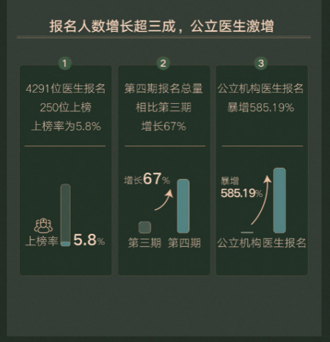 值得关注的是,本期评选活动共有4291位医美医生报名参与,覆盖中华医学会整形外科学分会、中华医学会医学美学与美容学分会等多个学术协会,大大提升了榜单的学术价值;公立机构医生争相参与,报名人数暴增585%,但上榜率仅为5.8%;此外,产生的新一批优秀医美医生中的部分代表,将有机会参与中国医美飞翔奖角逐。