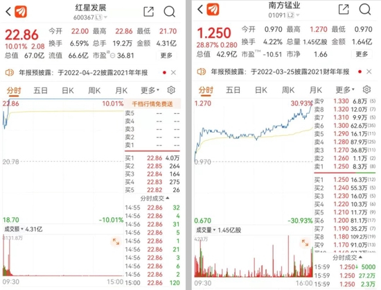 今日开盘后,红星发展便迅速涨停,最新股价为22.86元。港股南方锰业尾盘一度大涨30.93%,最终报收于1.25港元/股。