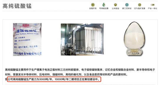 其官网显示,公司高纯硫酸锰生产能力为3000吨/年,10000吨/年二期项目正在筹划建设中。
