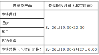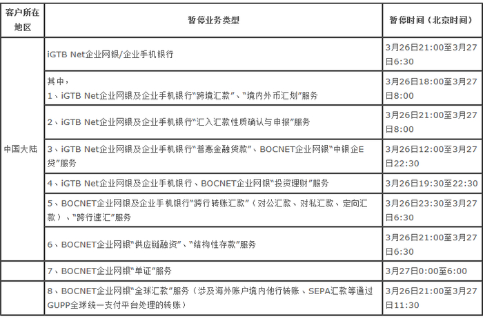 3月24日,中国银行在其官网发布了关于3月26-27日系统升级期间暂停投资理财相关服务、关于3月26-27日系统升级期间暂停企业网银、企业手机银行服务两则公告。