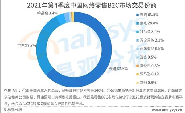 据Analysys易观数据显示,2015年第四季度,聚美优品尚能保持0.4%的市场份额,两年后,2017年的第四季度降至0.3%,到了2019年第一季度,这一数据下降为0.1%。至2021年第4季度,市场份额中已看不到聚美优品的影子。