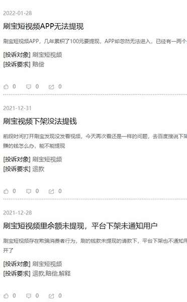 市场层面,近年来“刷宝短视频APP”频频被用户投诉被指激励观看模式充斥“套路”,奖金提现不仅需要邀请20名新用户加入,还要新用户注册当天看视频取得3000个“元宝”。
