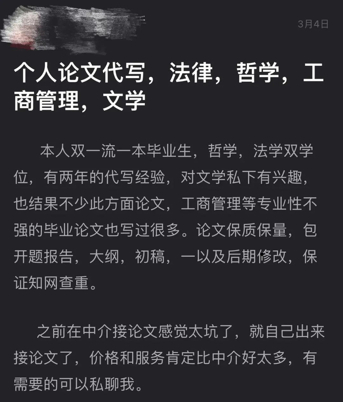 这类模式中还包括中介与写手合作方式,常见于长期从事代写论文的中介。由于近年论文审查要求愈加严格,为了安全起见,他们不再建立写手群,而是选择单独派单或者在朋友圈里派单,愿意接单的写手再与中介单独沟通。