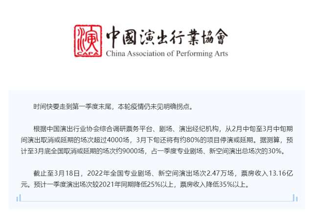 3月22日晚间,中国演出行业协会发布,本轮疫情仍未见明确拐点,预计至3月底全国取消或延期的场次约9000场。