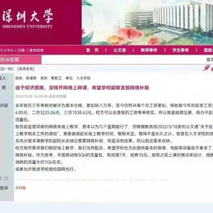 3月20日,深圳大学人文学院教职工陈星群在该校网站留言称,“由于我经济困难,没钱开网络上网课,希望学校能够发放网络补助”。