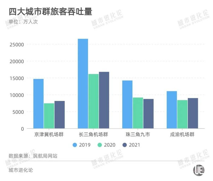 粤港澳大湾区机场群珠三角九市完成旅客吞吐量8724.1万人次,排名第三,但较2020年下降4.6%,恢复至2019年61.4%。