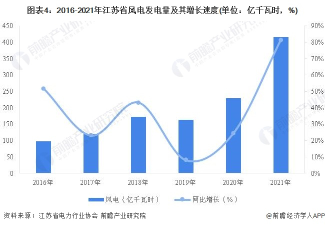 据江苏省电力行业协会统计数据显示,2021年,随着风电具体提速,江苏省新能源发电中,风力发电规模增长迅速,全省风电发电量415.66亿千瓦时,同比增长81.50%,占全省新能源总发电的56%。