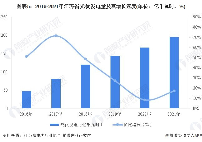 据江苏省电力行业协会统计数据显示,2021年,江苏省光伏发电规模进一步提升,太阳能发电量增长至195.32亿千瓦时,同比增长17.08%,占全省新能源总发电的26.3%。
