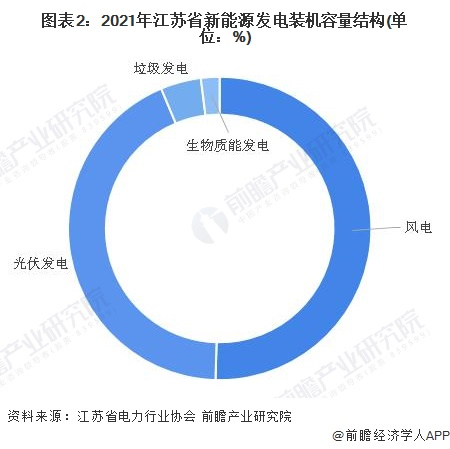 从新能源发电结构来看,截至2021年12月,江苏省风电装机容量2234.33万千瓦,占新能源发电总装机容量的50.44%;太阳能发电装机容量1915.95万千瓦,占新能源发电总装机容量的43.25%;垃圾发电装机容量190.97万千瓦,占新能源发电总装机容量的4.31%;生物质发电装机容量88.25万千瓦,占新能源发电总装机容量的1.99%。
