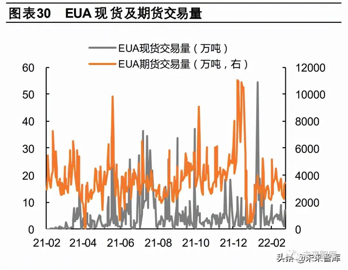 EU-ETS 交易场所集中,分工明确。运行之初,有多个交易所开展欧盟碳排放配额(EUA)的交易,包括洲际交易所(ICE)、 欧洲能源交易所(EEX)、欧洲气候交易所(ECX)、欧洲环境交易所(BlueNext)、北欧电力交易所(Nordpool)等。随着 碳市场不断发展,交易场所逐渐集中,当前主要通过 ICE 开展 EUA 的现货交易,并通过 EEX开展 EUA 的期货交易。2021 年 2月至今,EEX中 EUA期货累计交易量达 108.23亿吨,同期 ICE中EUA现货累计交易量仅有0.15亿吨,碳期货是EU-ETS 中的主要交易品类。(报告来源:未来智库)