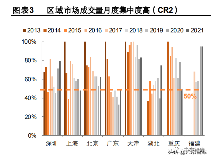 4)交易主体参与度受限。全国碳市场方面,无论是 2021年 2月起实行的《碳排放权交易管理办法(试行)》,还是 2021年 5 月印发的《碳排放权登记管理规则(试行)》,均未对机构及个人投资者参与全国碳市场的资质做出明确规定,因此参与主 体仍限于控排企业,流动性相对不足,加剧了企业集中交易倾向及碳价的波动。区域碳市场方面,非履约机构及个人投资者 的参与令流动性有所提升,如北京碳市场中非履约机构大量参与交易,但仍有发展空间。