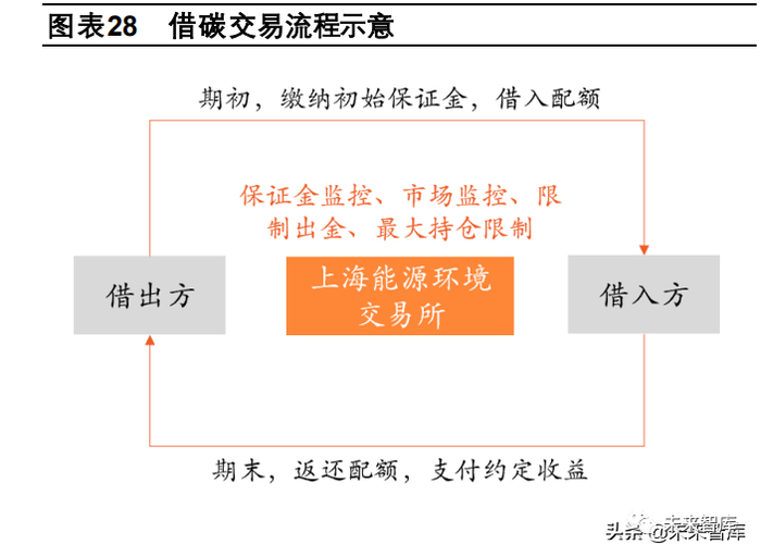 借碳交易及卖出回购可视为碳回购及逆回购的变体,是上海环境能源交易所独有的创新型碳金融工具。与常见碳回购或逆回 购需要其他非履约机构参与不同的是,借碳交易与卖出回购可以在履约机构间展开。借碳交易:是符合条件的配额借入方存入一定比例的初始保证金后,向符合条件的配额借出方借入配额并在交易所进行交易, 待双方约定的借碳期限届满后,由借入方向借出方返还配额并支付约定收益的行为。