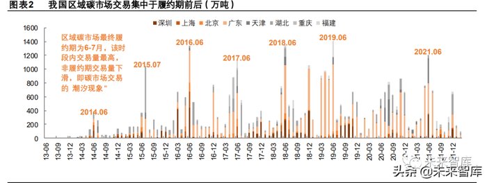 当前我国区域及全国碳市场碳价波动较大,实际不利于碳市场提效作用发挥。区域碳市场方面:“潮汐现象”严重,各区域 碳市场成交日期集中于履约期前后,各年度成交量最大的两个月占全年成交量比重多在 50%以上,并导致区域碳价波动较 大。全国碳市场在启动后也延续了这样的特征:2021 年全国碳市场交易主要集中于三个时间段,分别为 7 月开市之初,9 月末碳配额最终核定发放期及 11 月后临近履约期。交易量波动不利于碳价稳定,开市之初市场成交热情高涨,碳价在 50 元/吨以上,8、9月交易热情回落,碳价一度临近 40元/吨上下,12月中旬集中交易再度跌至 40元/吨以下,12月末履约压 力增大,碳价飙至 50元/吨以上。