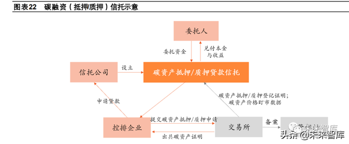 碳融资信托:碳融资类信托是信托公司设立信托,以碳资产为抵质押物,向融资人发放贷款,或设立信托,买入返售融资人 的碳资产。例如,兴业信托设立“利丰 A016 碳权 1 号集合资金信托计划”,该信托计划以海峡股权交易中心碳排放权公开 交易价格作为估价标准,通过受让福建三钢闽光股份有限公司 100 万碳排放权收益权的方式,向其提供绿色融资。