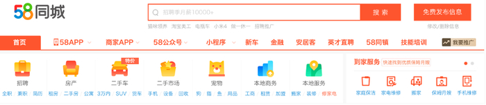 作为一个分类信息网站,58同城的业务涉及房产、招聘、汽车、二手、本地服务等多个领域。