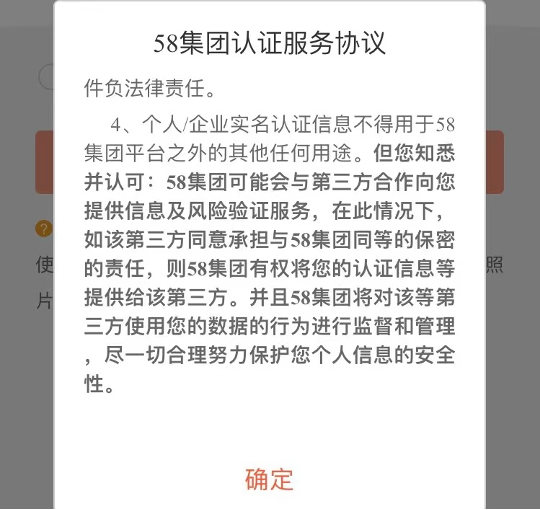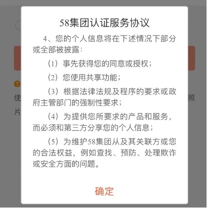 此外,记者还在《58集团认证服务协议》中注意到,用户的个人信息会在5种情况下部分或全部披露,其中便包括必须与第三方分享个人信息的情况。58同城表示,“如该第三方同意承担与58集团同等的保密责任,则58集团有权将用户的认证信息提供给该第三方。”
