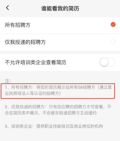 作为信息分类的中间平台,58同城链接的一方是接受信息的用户,另一方则是发布信息的商家。在平台的默认设置下,“所有招聘方”均能看到用户的简历,而切换到商家角度,细看58同城的入驻门槛和审核机制,或许能解释为什么用户个人隐私存在着被泄露的风险。