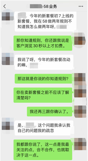 徐涛去找业务员理论,对方辩称是公司改了规则,并承认是自己疏忽。然而当2月17日徐涛要求58同城退款时,曾遭到明确拒绝。