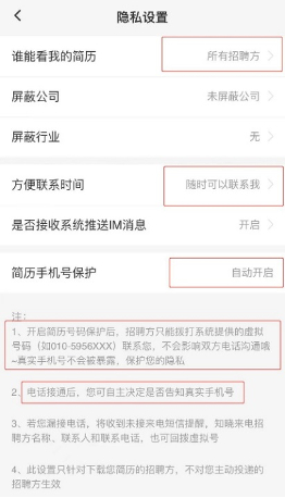 针对用户个人信息在58同城上的可视程度,3月中旬,《国际金融报》记者在58同城求职简历的“隐私设置”中看到,平台默认设置“所有招聘方”均能看到用户的简历,“方便联系时间”的默认设置则为“随时可以联系我”,如果用户希望“仅我投递的招聘方”才可以查看自己的简历,或希望招聘方在“工作日9点-18点”或“自定义时间”内联系自己,则需要专门设置。