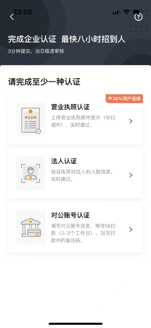 而入驻58同城,徐涛只需要提供营业执照。3月中旬,记者尝试在58同城进行企业认证时发现,“营业执照认证””法人认证”和“对公账号认证”,只需要完成其中一种。平台还显示,90%用户选择营业执照认证。