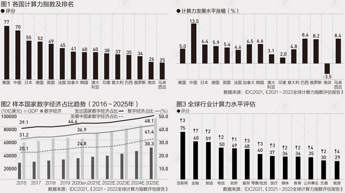 IDC、浪潮信息、清华全球产业院近日联合发布的《2021~2022全球计算力指数评估报告》(下称“报告”)显示,国家计算力指数与GDP的走势呈现出了显著的正相关。从十五个重点国家的计算力指数看,平均每提高1点,数字经济规模和GDP将分别增长3.5‰和1.8‰,预计该趋势在2021~2025年将继续保持。