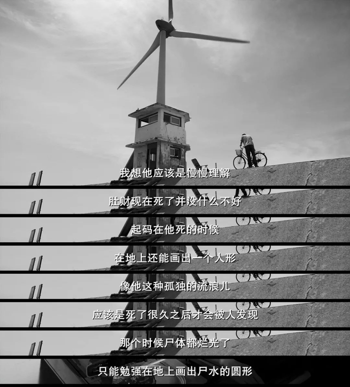 让我们看看全片的最高潮,导演的讲述也是极为克制——这真的导演的讲述,因为导演的画外音再次响起:“菜埔看着肚财留恋着眼前的景色,眼中透露出淡淡的不舍。他想要安慰肚财,却一句话都讲不出来。”这预示着一场死亡的来临。伴随着已经成为经典的《面会菜》配乐,肚财不明不白的死掉了。