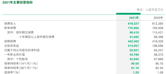 此外,与2020年度数据相比,中国人寿14个月和26个月保单持续率均有所下降;同期,退保率上升0.11个百分点至1.20%。
