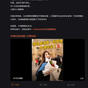 微博的文字内容写着:“今天我以牛津年级第一的成绩,从数学建模专业毕业了。学海无涯,未来的我,还会继续在牛津,攻读数学博士。虽然,拿到了牛津两个的奖学金博士offer。可是,依旧不得不承认,华人女性在数院真的是,少数又少数群体……”并配以一个女孩身着学士服,在牛津校园内参加毕业典礼的视频。