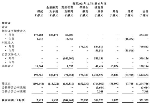 从收入结构来看,交银国际仅资产管理及顾问业务税前亏损2.05亿港元,其余业务均实现盈利。交银国际对此表示,2021年其资产管理及顾问服务费收入减少51.0%至5000万港元,其中自营交易亏损为1.4亿港元,是对其管理的若干资产管理安排回报的担保。