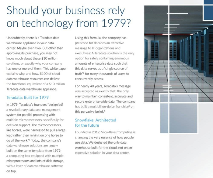 它写了一个小册子,用两个极具羞辱性的问题“那个Teradata数仓真的值一千万美金吗?”、“你的业务真的应该依赖来自1979年的技术么?”来引战Teradata。Teradata当然非常愤怒,他们逐条进行了一系列回复,但这正好上了Snowflake的当。
