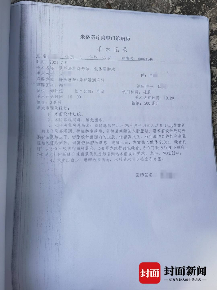 据夏彤提供的病历显示,米格美容医院对她的胸部诊断为:乳房下垂、小乳症。 医生给出的手术方法是:双环法乳房悬吊、假体隆胸术。