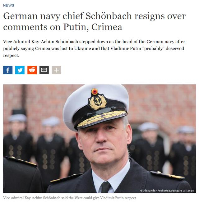 德国海军总监舍恩巴赫因涉俄言论辞职(图截自“德国之声”报道)