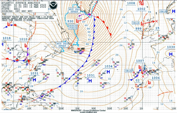 北京时间3月14日早晨的北大西洋地面天气图,可以看到图片上侧、位于格陵兰岛西南方的本次主角,此时它的中心最低气压下降至930hPa | 美国海洋与大气管理局(NOAA)