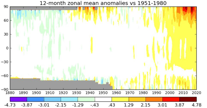 1880-2020年间,地球表面气温在不同纬度(纵坐标)和年代(横坐标)的距平(基准值为1951-1980年平均) | NASA
