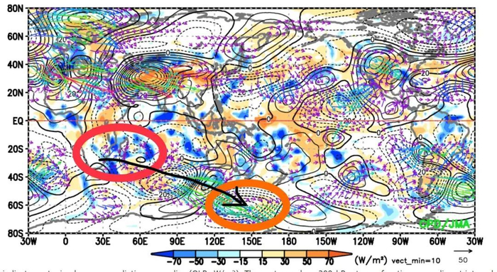 3月15日全球向外辐射长波异常(填色,反应对流活动异常)和200hPa波作用通量(彩色箭头)分析图。可以看到,从莫桑比克海峡对流活跃区(红色)激发的波列(黑色箭头)向东南传播到了东南极洲,形成本次的阻塞高压(橙色) | 日本气象厅