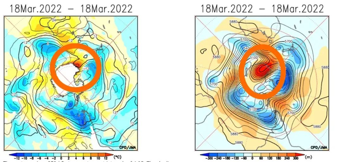 3月18日南极地区对流层低层(850hPa)温度异常与对流层中层(500hPa)高度场异常分析,两张图的橙色圈均圈出了造成本次极端偏暖的阻塞高压。